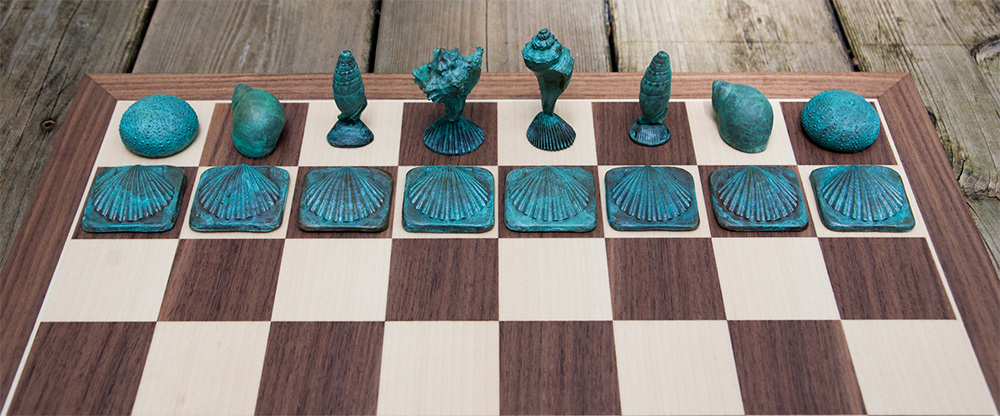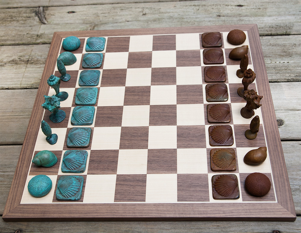 This cast bronze chess set was made after moulds taken of shells from my mother’s collection.